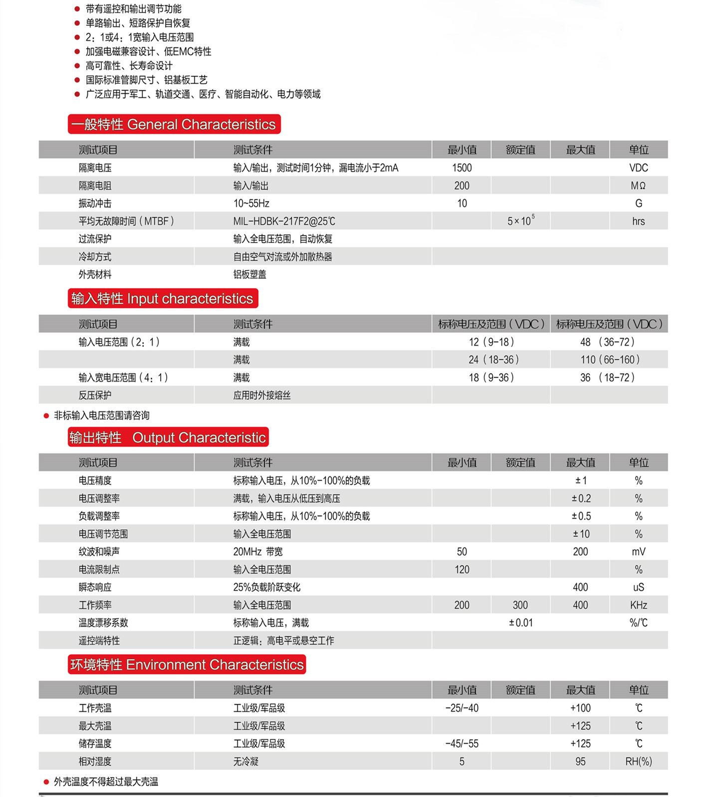 典型性能:寬壓輸入(1:2或1:4)、單路、雙路輸出,輸出低紋波噪聲、高穩壓精度、長期短路保護自恢復、使用效率高,高隔離耐壓