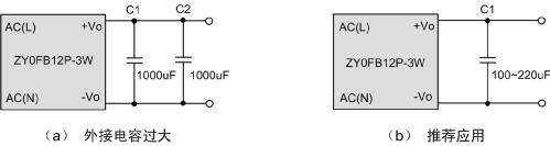 如圖2中的電路(a)所示,一個3W的模塊,輸出使用了2000uF的電容,而通過查閱產品手冊了解到,模塊建議最大輸出電容為800uF。輸出電容過大可能導致啟動不良,而對于不帶短路保護的微功率DC-DC模塊,輸出電容過大甚至可能導致模塊永久損壞。